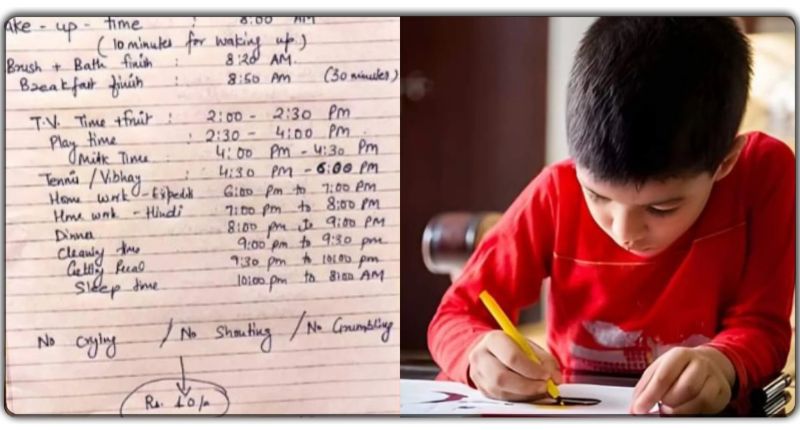 दरअसल, एक तस्वीर सोशल मीडिया पर बड़ी तेजी से वायरल हो रही है जिसमें छोटे से बच्चे के लिए टाइम टेबल शेड्यूल किया गया है। इस टाइम टेबल के मुताबिक उसे सोकर उठने से लेकर रात तक का काम करना होगा। पिता द्वारा बनाए गए इस टाइम टेबल में बच्चे को खलेने कूदने का भी समय दिया जाएगा