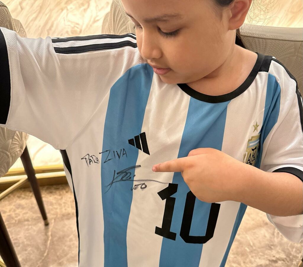 वहीं, जीवा अपने पापा धोनी की तरह ही महान फुटबॉलर लियोनेल मेसी की भी बहुत बड़ी फैन हैं. हाल ही में अर्जेंटीना के फीफा वर्ल्ड कप जीतने के बाद उन्हें मेसी से साइन की हुई जर्सी गिफ्ट में मिली थी. साक्षी धोनी ने जीवा को मिले इस गिफ्ट के साथ इंस्टाग्राम पर तस्वीरें शेयर करते हुए लिखा था- ‘जैसे पिता, वैसी बेटी’