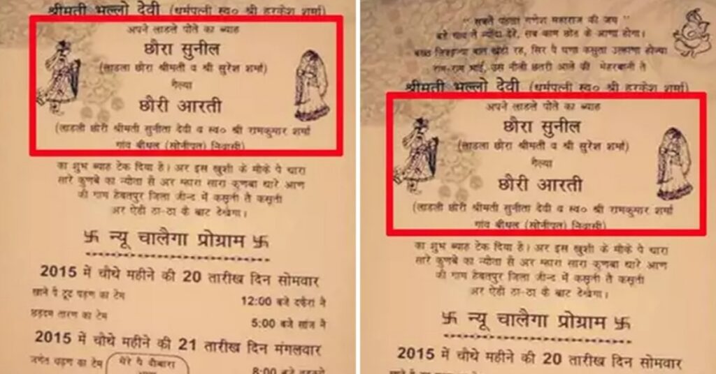 इतना ही नहीं दूल्हा और दुल्हन के नाम के आगे चोरा और चोरी भी लिखा जाता है। सबसे दिलचस्प बात यह है कि यहां सिर्फ नाम ही नहीं पता, कार्यक्रम और तारीख भी हरे रंग की भाषा में मिलती है। कार्ड में मिली तारीख के मुताबिक यह कार्ड 2015 का है। इस कार्ड को देखकर हर कोई हैरान है. मेहमानों ने जब इस कार्ड को देखा तो वो भी सोच रहे थे कि वो कहां जा रहे हैं. आज भी ये कार्ड काफी चर्चा में देखा जा रहा है. रिस्पॉन्स मिल रहा है.