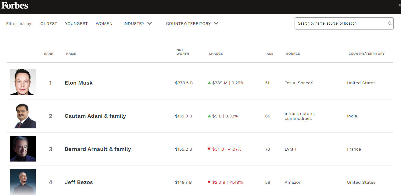 टेस्ला के प्रमुख और दुनिया के सबसे अमीर आदमी एलोन मस्क, जो सूची में सबसे ऊपर हैं, की कुल संपत्ति $273.5 बिलियन है, जबकि अमेज़न के संस्थापक और सीईओ जेफ बेजोस की कुल संपत्ति $149.7 बिलियन है।