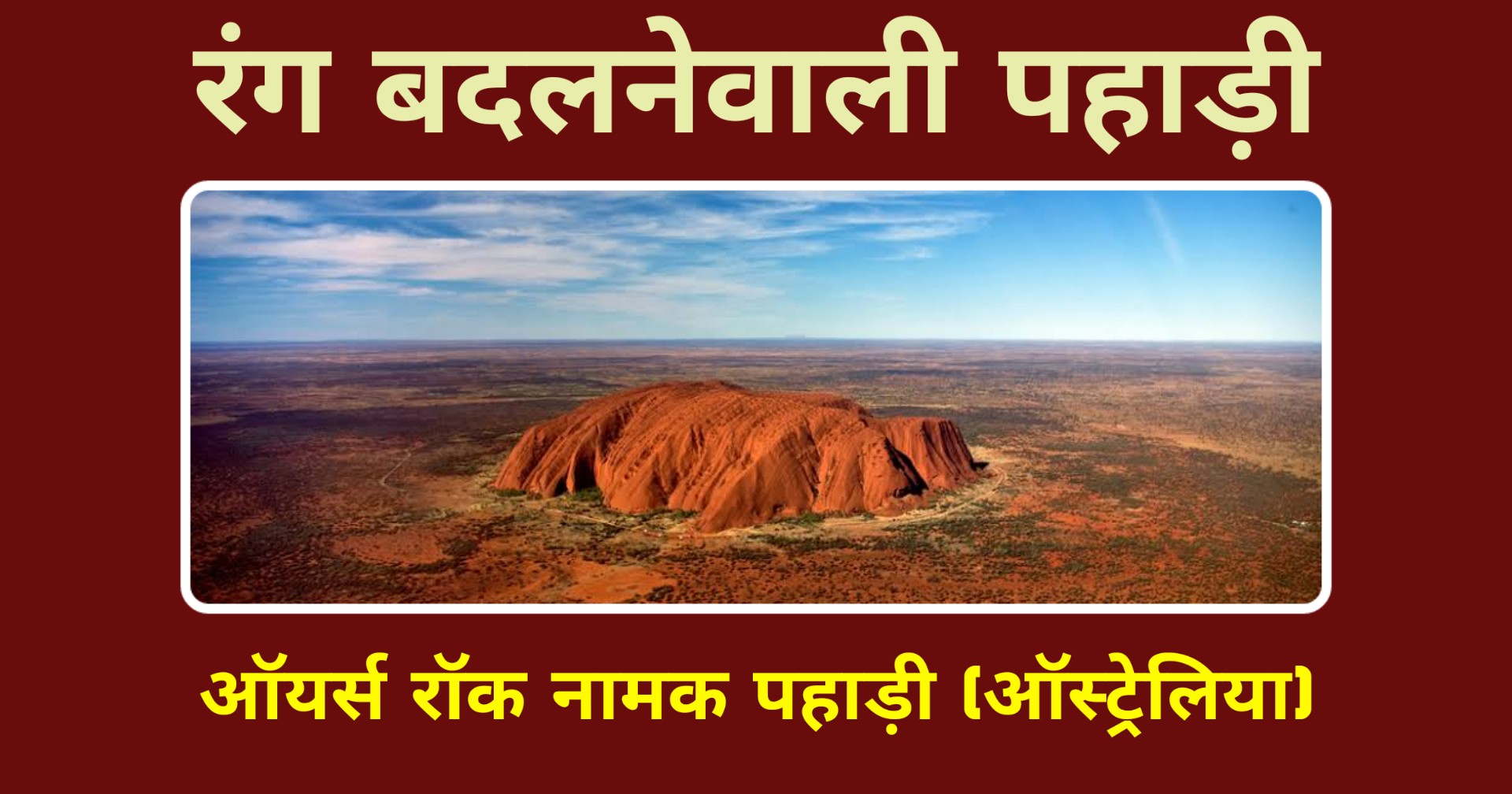 ये पहाड़ी आस्ट्रेलिया (Australia) के उत्तरी इलाके में है, जिसे आयर्स राक (Ayers Rock) भी कहा जाता है.ये पहाड़ी हर रोज सुबह से लेकर शाम तक रंग बदलती है. यही नहीं, ये पहाड़ी हर मौसम में उसका रंग बदलता है.