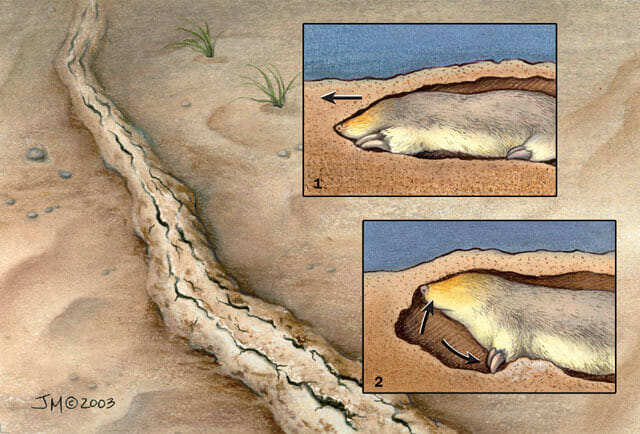 गोल्डन मोल भूमिगत सुरंगों में निकाला जाता है। बाहर, उनकी हरकतें जमीन की लकीरों की तरह दिखती हैं।