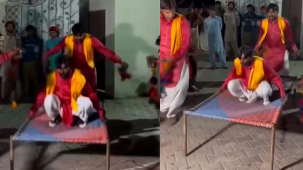 वायरल वीडियो में कुछ लोग बेहद फनी डांस करते दिख रहे हैं। एक शख्स खटिया लेकर बीच में बैठा हुआ है और बाकी के लोग ढोल बजाते दिख रहे हैं।