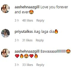 फैंस ने शहनाज गिल के वीडियो के कमेंट सेक्शन में जाकर रेड हार्ट और फायर इमोजीस पोस्ट किया। “जो शहनाज़ से जले जरा साइड में चले (sic)”, “हॉटनेस ओवरलोड (sic)”, “कीप शाइनिंग ऑलवेज (sic)” और “Bawaaaallllllllll (sic)”, “आग लगा दिया (sic)” जैसी टिप्पणियाँ, दूसरों के बीच वीडियो पर पोस्ट किया गया।